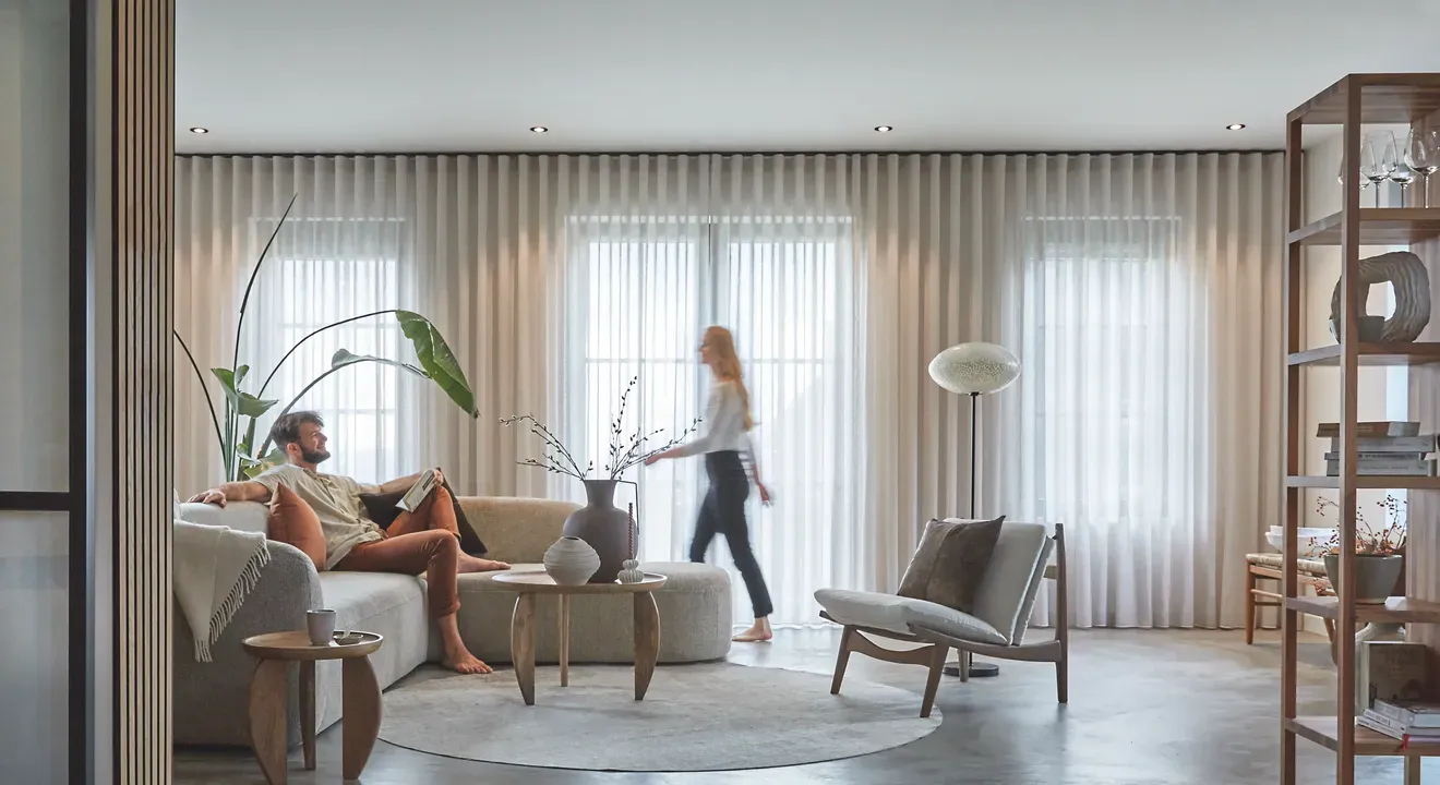 Een foto kan nooit vastleggen wat By Tzum bijzonder maakt. De structuur voelen, de subtiliteit van een weefsel zien en het spel van licht ervaren - dat kan alleen in de showroom. Daar ontdek je hoe verschillende stoffen en transparanties werken in echt daglicht en hoe ze je interieur direct veranderen.